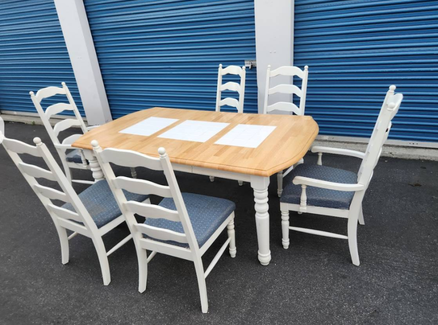 Farmhouse butcher block wood dining table 6 ladderback chairs AshleyPosted on: 01-21-2026 11:27