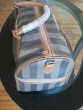 This Dissona travel bag can be a carryon luggage for flying. Its dimension is 18"×10"×11". The bag has 4 pockets on the outside and has a shoulder-strapping belt.