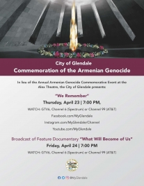 Glendale, CA - Due to the COVID-19 pandemic and the precautions being taken to prevent the spread of the virus, the City of Glendale will present an alternative to its Annual Armenian Genocide Commemorative event that was scheduled to take place on April 24, 2020 at the beautiful Alex Theatre. In lieu of the live in-person commemoration, the City of Glendale has coordinated a virtual experience to be released on Thursday, April 23, 2020 at 7:00 PM. This is a very important event for Glendale, and the City’s GTV6 team has been working hard to produce a video montage of previous years’ events, which will include video messages of solidarity from Glendale Mayor Vrej Agajanian, Councilmembers Najarian, Devine, Kassakhian, and Brotman, as well as Congressman Adam Schiff, Senator Anthony Portantino, Assemblymember Laura Friedman, and LA County Supervisor Kathryn Barger. The video will be broadcast on GTV6, channel 6 (Spectrum) and channel 99 (AT&T), as well as streamed on Facebook.com/MyGlendale, Instagram.com/MyGlendale/Channel, and YouTube.com/MyGlendale.