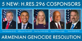 Five more Members of Congress have co-sponsored H.Res.296 – the bipartisan resolution locking in permanent U.S. recognition of the Armenian Genocide, the Armenian National Committee of America (ANCA) reports.