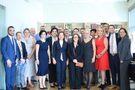 President Dr. Karin Markides, Provost Dr. Randall Rhodes, Director of Admissions Arina Zohrabian and Director of Communications Narek Ghazaryan welcomed the delegates. Dr. Rhodes briefed the guests on the history of the University and led them through a tour of the AUA campus with stops at the AGBU Papazian Library, the Large Auditorium, and the Student Union, and classrooms in the Paramaz Avedisian Building. A small reception followed at the Akian Art Gallery, during which the group discussed a vision for future collaborations between the University and the states and counties represented.